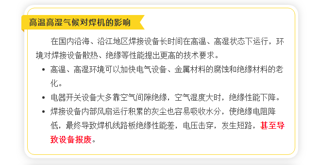 國內國沿海、沿江地區的焊接設備長時間在高溫、高濕、鹽霧狀態下運行,這對焊接設備散熱、絕緣等性能提出了更高的技術要求。為了滿足充分滿足客戶的需求,時代公司推出了耐鹽霧型NB-500(A160-500)半自動氣保焊機。