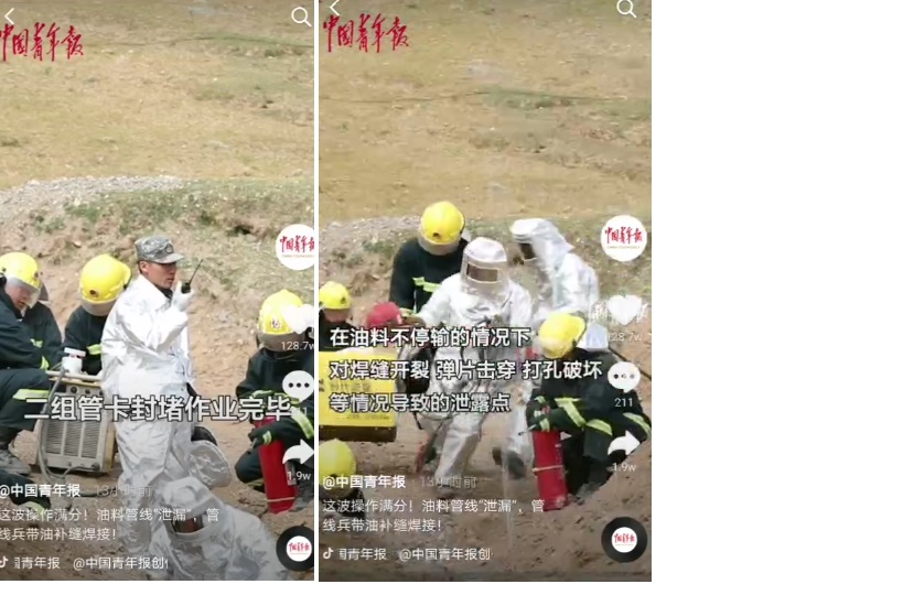 據《中國青年報》報道,9月19日西藏軍區青藏兵站某管線大隊組織實戰化輸油管線鋪設搶修演練。在油料不停輸情況下對焊縫開裂,單片穿孔,打孔破壞等情況導致的泄露點,官兵們采用補片焊接,管卡封堵,帶油焊接的方式對管線漏點組織搶修。