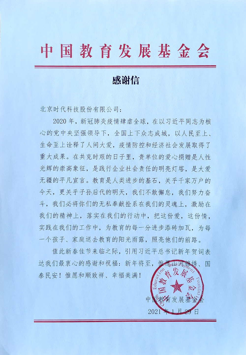 中國傳統的節日-新春佳節-來臨之際,中國教育發展基金會給北京時代科技股份有限公司發來了感謝信!這是中國職業教育行業對時代公司工作的嘉獎和肯定,全體時代人將繼續努力工作為推動中國職業教育事業的發展貢獻力量!