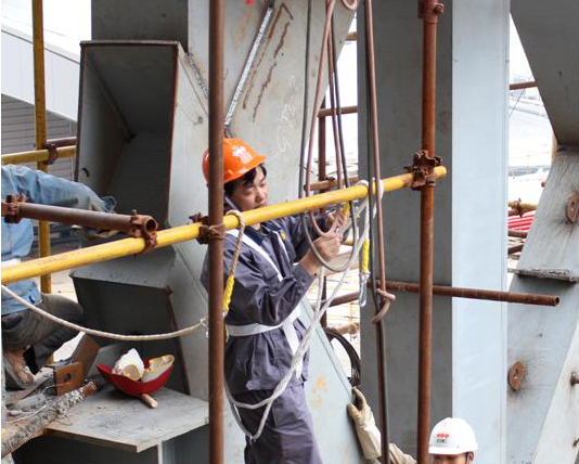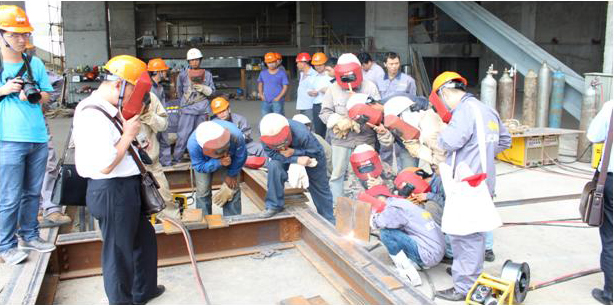 獻藝活動結束之后,時代公司高級技師張自祥和另外兩名全國五一勞動獎章獲得者在工地現場根據施工方的要求,還做了板對接橫焊、立焊和平焊示范演示,與承建方焊工師傅們進行了面對面交流,掀起了新一輪學習、交流的熱潮。