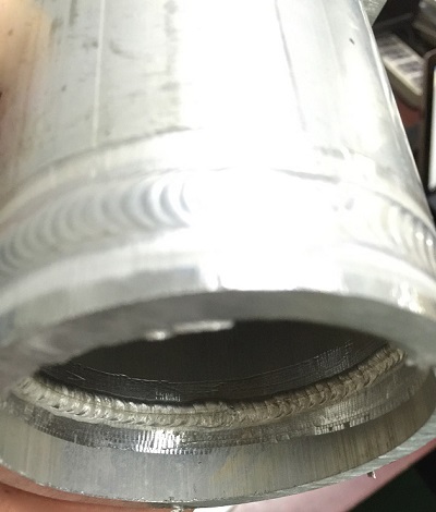 第二模塊鋁合金構(gòu)建中鋁管的焊接難點主要在于背部融透(如圖6)和內(nèi)在質(zhì)量的保證。背部融透主要是考驗選手對熔池的理解,在組對焊縫0間隙的情況下,如何能夠識別熔池溫度是否達到,送遞焊絲時間的選擇,這些都至關(guān)重要,而且在焊接過程中,由于鋁合金的導(dǎo)熱系數(shù)大,焊接過程中隨著溫度的上升,焊接速度也會越來越快,如果手法跟不上,只是依靠小電流慢速焊,這樣就會在某一點(比如引弧處)不停的加熱,局部時間加熱久了焊縫內(nèi)部會很容易出現(xiàn)過熱裂紋,焊縫表面發(fā)白無光澤,所以鋁合金焊接一般要求大電流快速焊接,也是為了在引弧初期就能夠快速打開鋁合金表面的Al2O3薄膜。該薄膜熔點高達2050℃,極大地超出了鋁的熔點(660℃),由于這層薄膜的保護,所以鋁不易產(chǎn)生腐蝕,但在焊接時,Al2O3會阻礙熔池金屬良好結(jié)合,容易形成夾渣氣孔等缺陷,可以說是焊接的障礙,所以在鋁合金焊接中要想達到探傷一級確實很難。一般要先進行酸堿水清洗或機械清理等前期處理。還要保證干燥不潮濕的情況下焊接才能夠保證質(zhì)量,當(dāng)然對于選手的焊接操作技能也是首選。這次參賽的65名選手中,該項射線探傷滿分40分的情況下只有一人滿分,30分以上的有7人,內(nèi)在質(zhì)量不得分的占多數(shù)。這與鋁合金焊接普及面較窄也有關(guān)系。隨著這項賽事的不斷進展。我想在不久將來大家一定會攻克難關(guān),充分掌握好這門技術(shù)。