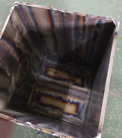 對于第三模塊中不銹鋼結(jié)構(gòu)件的焊接,個人觀點是其焊接難點要更甚于鋁合金的焊接。眾所周知不銹鋼在高溫狀態(tài)下非常容易氧化,而且變形量也較大。這次的不銹鋼結(jié)構(gòu)件組對完畢后,所有焊縫根據(jù)要求都不允許留間隙、開坡口焊接,并在背部充氣的情況下實現(xiàn)單面焊雙面成型(如圖7),它的焊接難點之一首先是為防止變形,如何選擇好組對之后的焊接順序,其次是焊接過程中如何能夠保證一次焊接背部成型和表面焊縫成型不氧化,乍聽起來好像這兩點有些矛盾,首先要想保證在不留間隙的情況向背面焊透,就要使熔池的溫度充分達到,而熔池溫度一旦過高焊縫表面就很容易氧化發(fā)黑,本屆比賽各路選手也是各顯其能,對于氬弧焊噴嘴的使用從6號嘴到10號甚至更大都有使用。其實從理論上來講,要想使氬弧焊接不銹鋼表面成型好,顏色好,主要就是氣體的保護效果,如果比賽允許使用氬氣保護拖罩進行三重保護,即熱影響區(qū)也保護起來,那么焊縫達到銀白色的金屬光澤也是有可能的,但這次只允許兩重保護(即內(nèi)充氣和氬弧槍本身氣體),那么對于焊縫的正表面只能采取大口徑噴嘴進行,才能擴大保護范圍,如果條件允許,也可以采用噴嘴內(nèi)裝有濾網(wǎng)的大口徑噴嘴進行焊接,這樣的氣體保護會更均勻。但前提是采用大噴嘴口徑的焊槍對焊接過程中選手對熔池觀察的視線會有所影響,也要逐漸適應(yīng)。這次大賽對于大噴嘴的使用只有少數(shù)單位想到了這一點。隨著本次大賽的結(jié)束,我想以后對于不銹鋼焊接的氧化問題,會有更多的單位熟悉、掌握,甚至想出更好的辦法來解決不銹鋼焊接氧化的問題。
